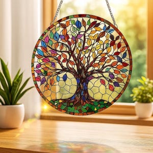 Handmade Tree of Life Stained Glass Window Hanging, Round Suncatcher Green Leaves Panel